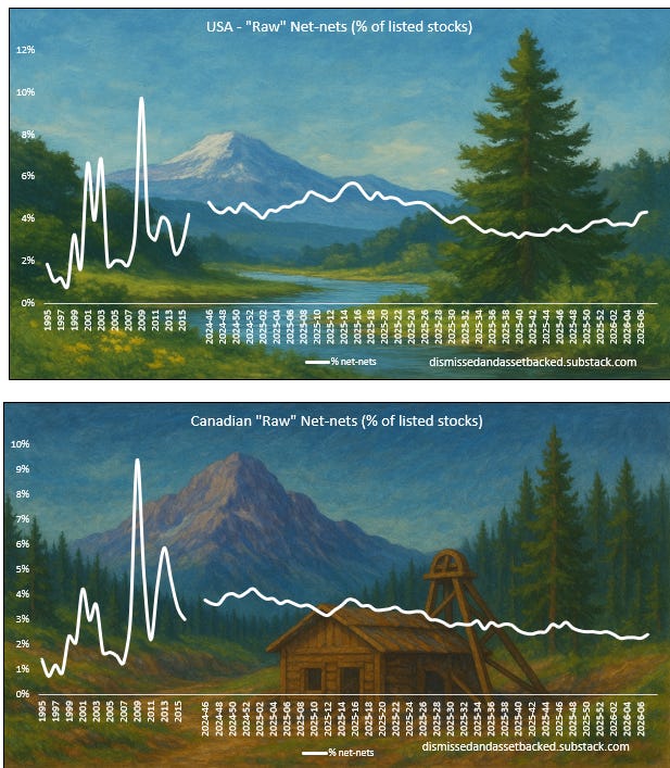 Benjamin Graham suggested that one way to measure the valuation of the overall market was to assess the number of net-nets available. When many such opportunities exist, it indicates a cheap market overall, while their absence suggests that the market is expensive. Today’s net-nets, however, are not the same as Graham’s net-nets. Many are un-investable being Chinese RTO’s, loss-making biopharma’s etc. But we do think it is interesting to follow this number over time, and what percentage of total listed stocks qualify as a “naked” net-net without any type of quality adjustments to make them investable.