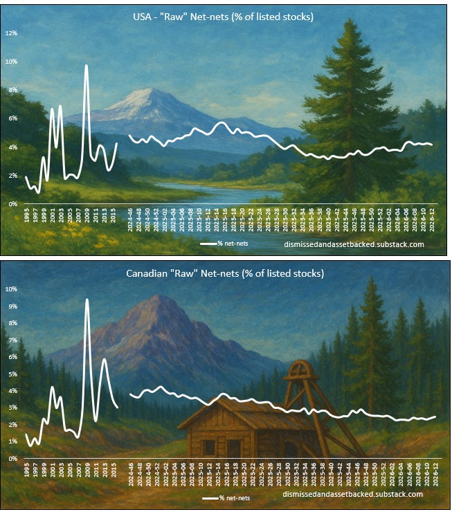 Benjamin Graham suggested that one way to measure the valuation of the overall market was to assess the number of net-nets available. When many such opportunities exist, it indicates a cheap market overall, while their absence suggests that the market is expensive. Today’s net-nets, however, are not the same as Graham’s net-nets. Many are un-investable being Chinese RTO’s, loss-making biopharma’s etc. But we do think it is interesting to follow this number over time, and what percentage of total listed stocks qualify as a “naked” net-net without any type of quality adjustments to make them investable.
